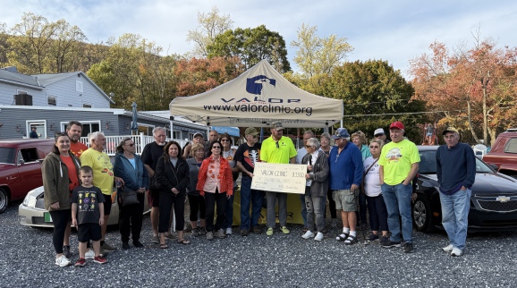 At the final car cruise of the season on October 19, 2025, Blue Mountain Classics Car Club (BMC) proudly presented a donation of $3,300 to VALOR Clinic Foundation to support the nonprofit’s mission to improve access to quality healthcare and shelter of Veterans. BMC President Donna Tully (holding microphone) presents the check to VALOR representative Greg Granese (green shirt) surrounded by members of the club. BMC thanks all our car-enthusiasts for donating to support VALOR!